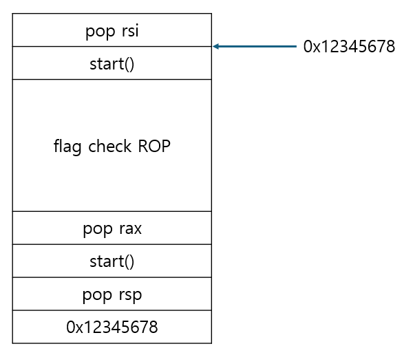 rax 레지스터에 start주소를 저장한 뒤 rsp를 start()주소가 저장된 위치까지 끌어올려 flag check routine과 이후 rop chain을 보존합니다.