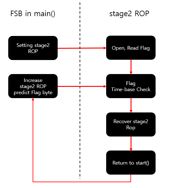 첫 호출 이후부터 rop의 플래그 예측 값만 증가 시켜주며 익스 시간을 감소시켰고 rop에서 플래그 검사 이후 다음 플래그 검사 전 사이에 크래시가 발생하면 플래그인 것으로 간주되도록 하였습니다.