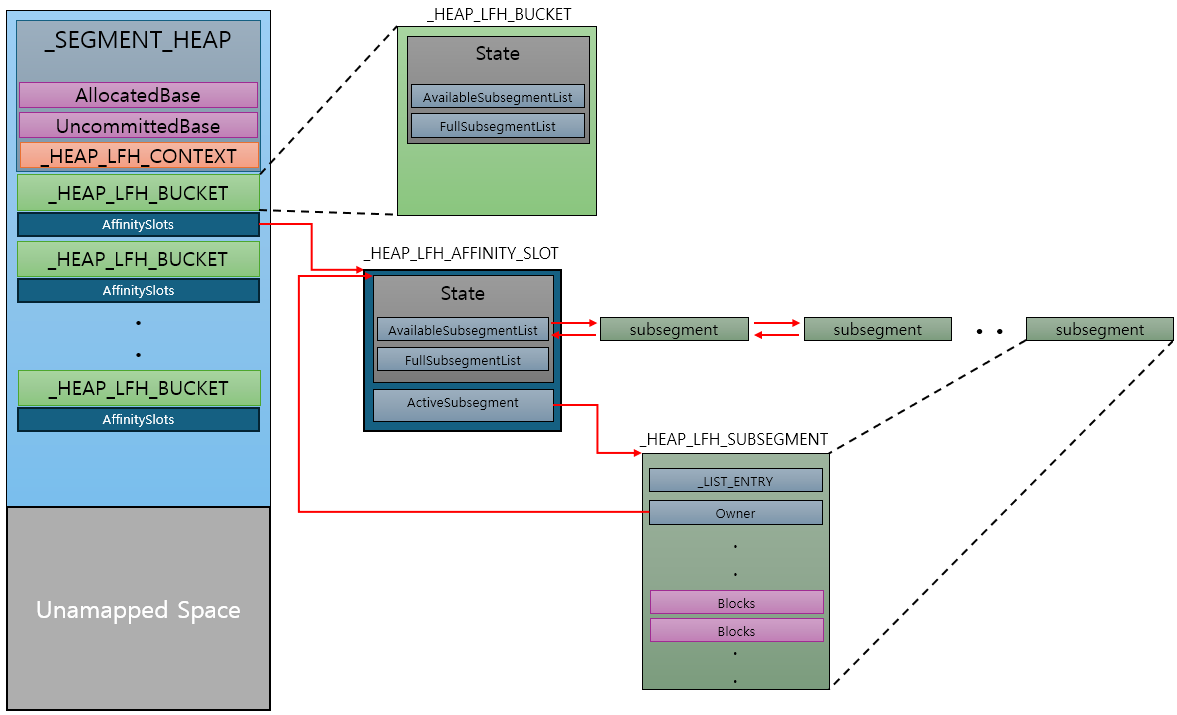 하지만 Windows11 24H2부터 Owner포인터 필드가 사라지면서 해당 필드를 통해 바로 _HEAP_LFH_AFFINITY_SLOT에 접근할 수는 없지만 Subsegment들은 _LIST_ENTRY로 연결되어 있고 해당 리스트 또한 _HEAP_LFH_AFFINITY_SLOT과 연결되어있어 이를 통해 _HEAP_LFH_CONTEXT까지 접근이 가능합니다.